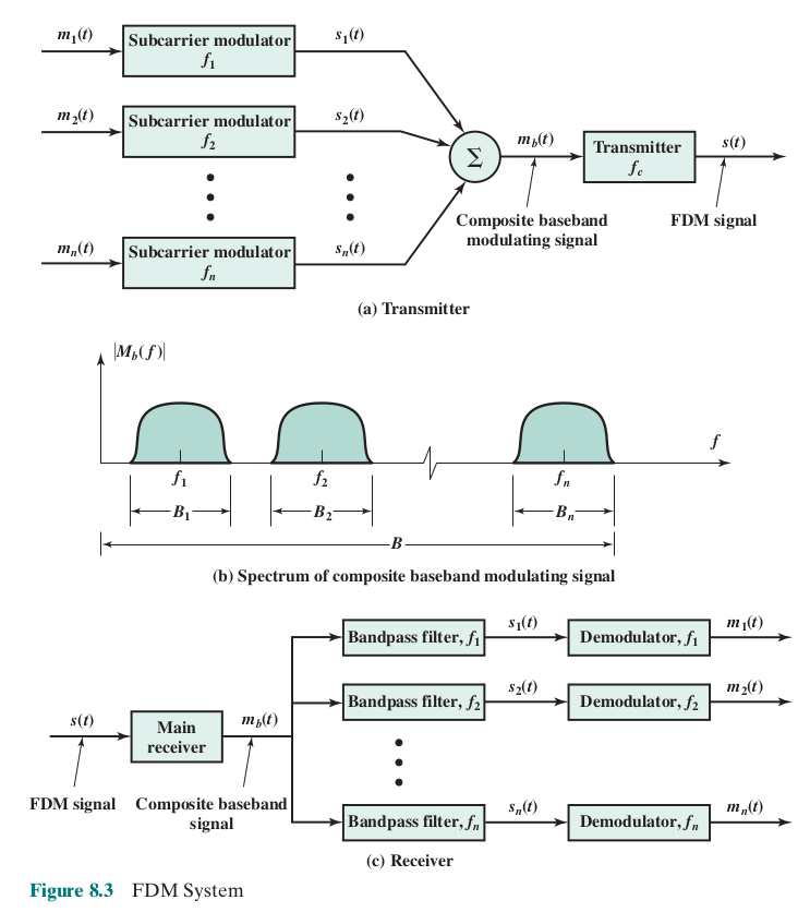 FDM (F). Es posible utilizar FDM cuando el ancho de banda útil del medio de transmisión supera el ancho de banda requerido por las señales a transmitir. Se pueden transmitir varias señales simultáneamente si cada una de ellas se modula con una frecuencia portadora diferente y las frecuencias portadoras están suficientemente separadas para que los anchos de banda de las señales no se solapen de forma importante.