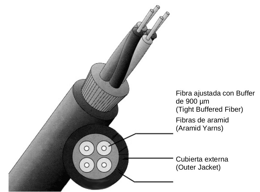 En los cables de estructura o construcción ajustada (Tight Buffered) la funda plástica está directamente aplicada sobre la funda óptica. Este tipo de estructura refuerza mecánicamente la fibra y le da la flexibilidad necesaria para la fabricación de latiguillos o para la instalación de cables en el interior de los inmuebles.