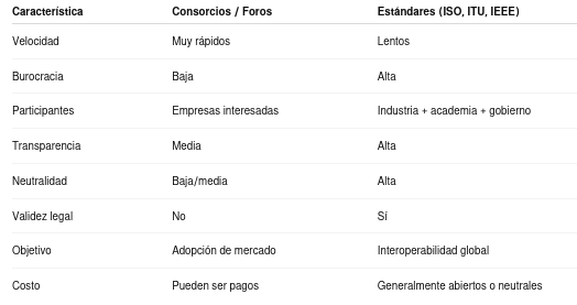 Los estándares formales son mucho más lentos y burocráticos, debido a que requieren consenso internacional y deben pasar por etapas de revisión técnica y regulatoria. Sin embargo, esta lentitud garantiza documentos mucho más estables, neutrales, exhaustivos y con alto nivel de rigor técnico, lo que asegura la interoperabilidad entre fabricantes y su reconocimiento oficial a nivel mundial