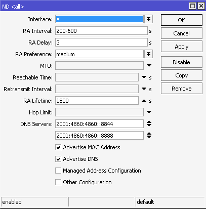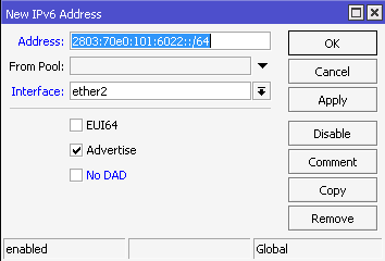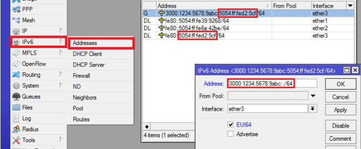 ipv6 address : 3000:1234:5678;9abcd, prefix: /64 , advertise=yes