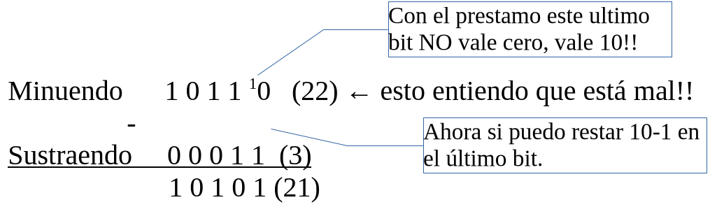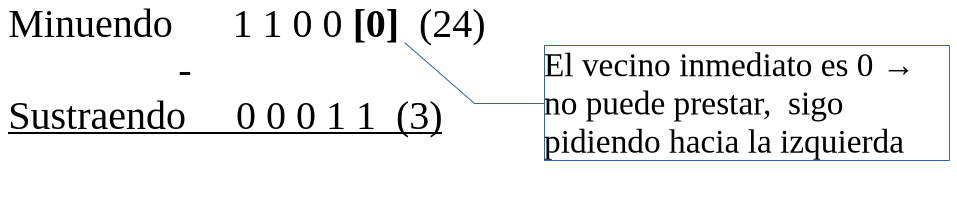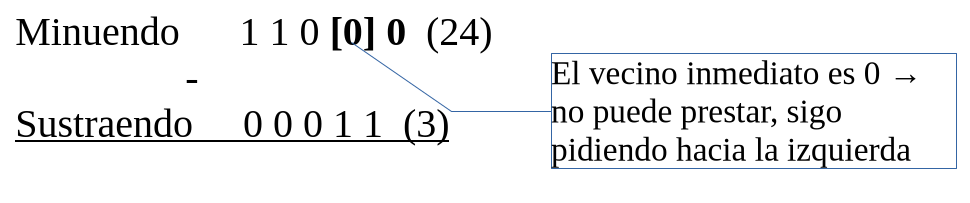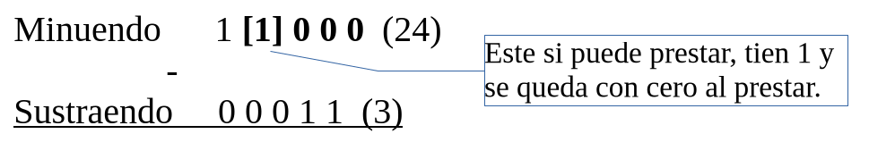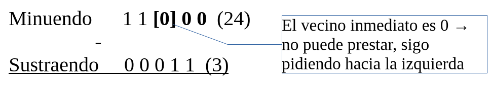 Para comprender esto, veamos el siguiente ejemplo, donde realizamos la resta de números naturales A–B, siendo A=110002=2410 y B=000112 = 310 , el resultado debería dar 2110 o 101012.