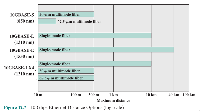 10GBASE-E (extendida): diseñada para transmisiones de 1.550 nm sobre fibras monomodo. Puede alcanzar distancias de hasta 40 km.