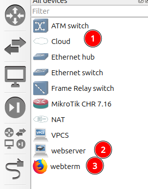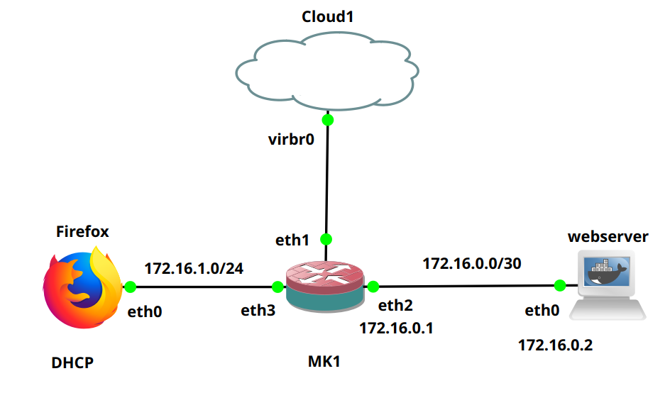 Luego agregamos el MK1(1) , el Webserver(2) y un maquina con navegador Firefox(3).