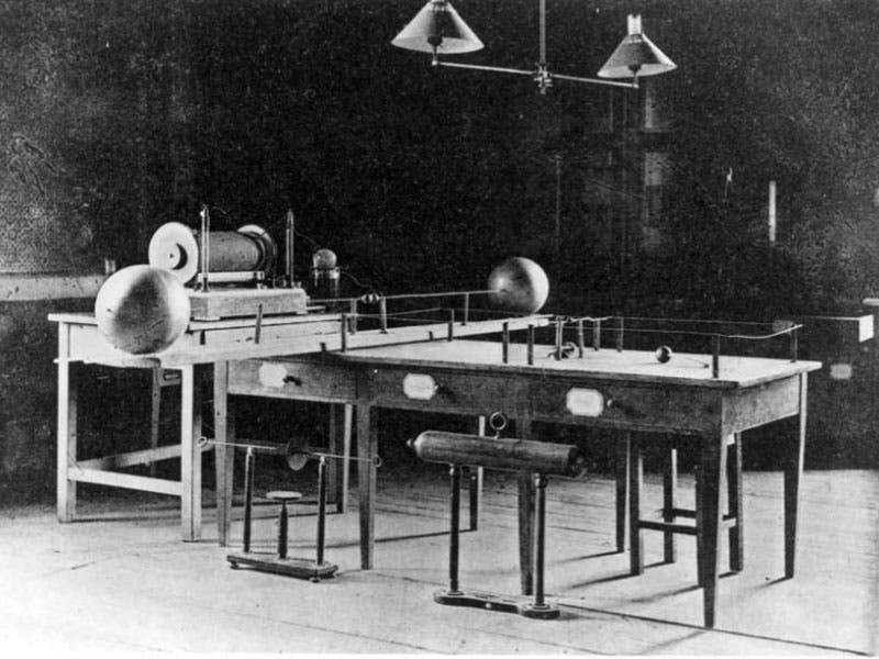 Los fundamentos de la teoría electromagnética moderna fueron formulados en 1873 por James Clerk Maxwell, quien hipotetizó, basándose únicamente en consideraciones matemáticas, la propagación de ondas electromagnéticas y la idea de que la luz era una forma de energía electromagnética. La formulación de Maxwell fue adaptada a su forma moderna por Oliver Heaviside durante el período de 1885 a 1887. Heaviside fue un genio solitario cuyos esfuerzos eliminaron muchas de las complejidades matemáticas de la teoría de Maxwell, introdujeron la notación vectorial y proporcionaron una base para aplicaciones prácticas de ondas guiadas y líneas de transmisión. Heinrich Hertz, un profesor alemán de física y un experimentador talentoso que comprendió la teoría publicada por Maxwell, llevó a cabo una serie de experimentos entre 1887 y 1891 que validaron la teoría de ondas electromagnéticas de Maxwell. La Figura más abajo es una fotografía del equipo original utilizado por Hertz en sus experimentos.